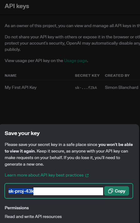 - Click “Create a new secret key” and name it “My first API key”